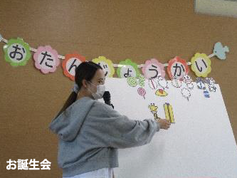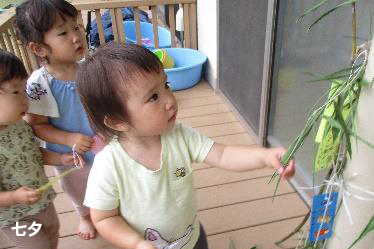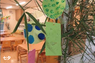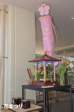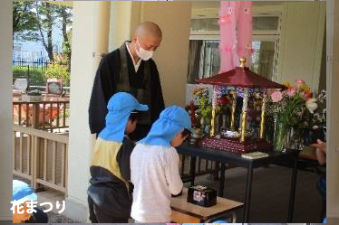 花まつり:子どもたちが心を込めてお釈迦様の誕生 をお祝いし、花御堂の周りにお花を飾り、 お釈迦様に甘茶をかけてお祈りします。